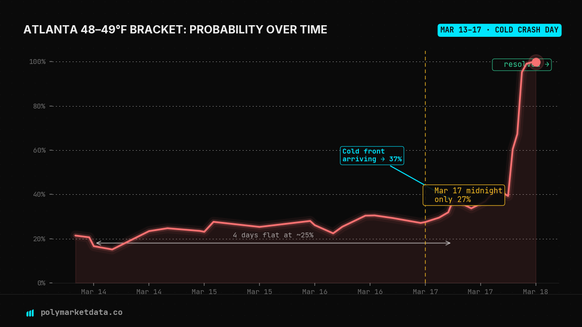 The March 2026 megastorm delivered the sharpest temperature swing in the US this winter. We tracked how Polymarket's daily weather markets priced — and mostly failed to anticipate — Atlanta's 28°F temperature collapse in 72 hours.