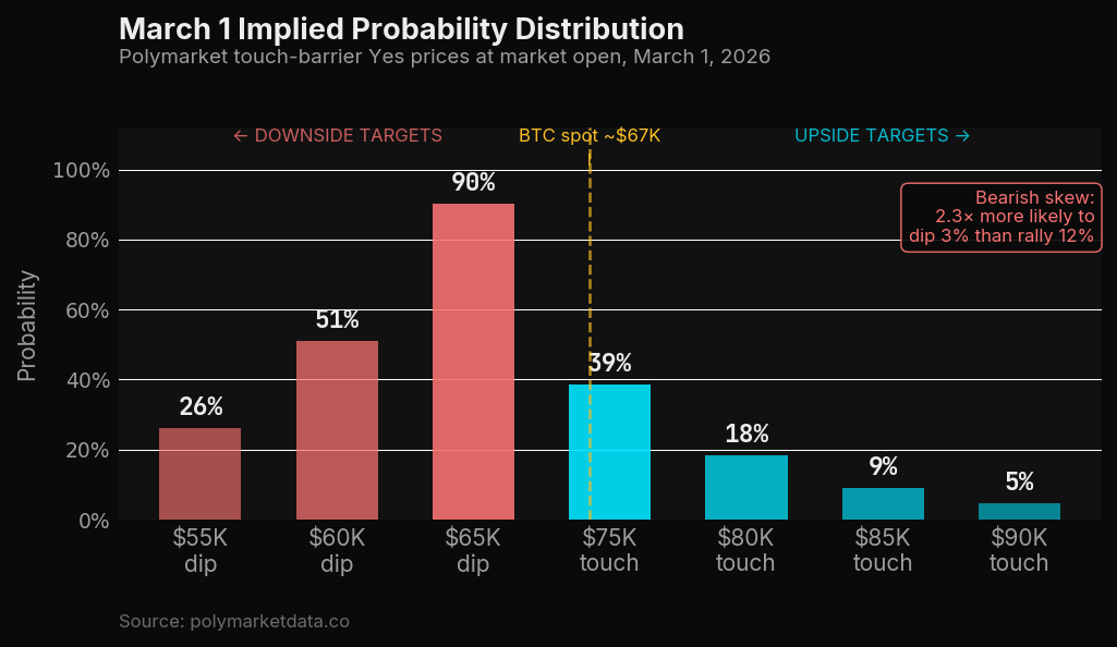 The bearish skew is immediately visible. The crowd was assigning 90% probability to a $65K touch (2.9% below spot) and only 38.6% probability to a $75K touch (12% above spot). In risk-reversal terms, that's an enormous premium on downside outcomes relative to the distance of the strikes. Roughly put: the crowd thought BTC was 2.3× more likely to dip 3% than to rally 12%.