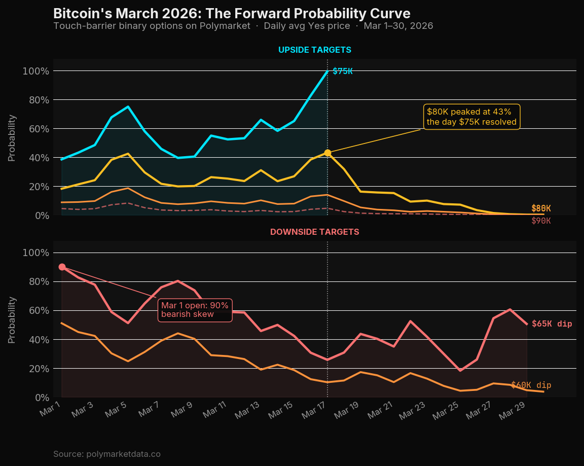 On March 1, 2026, if you wanted to know where Bitcoin was headed that month, you could have read the analyst reports. Or you could have looked at Polymarket's binary touch options, which told a more precise and ultimately correct story: a 90.2% probability that BTC would dip to $65K at some point in March, alongside a 38.6% probability it would touch $75K — with near-zero chance of anything above $85K.