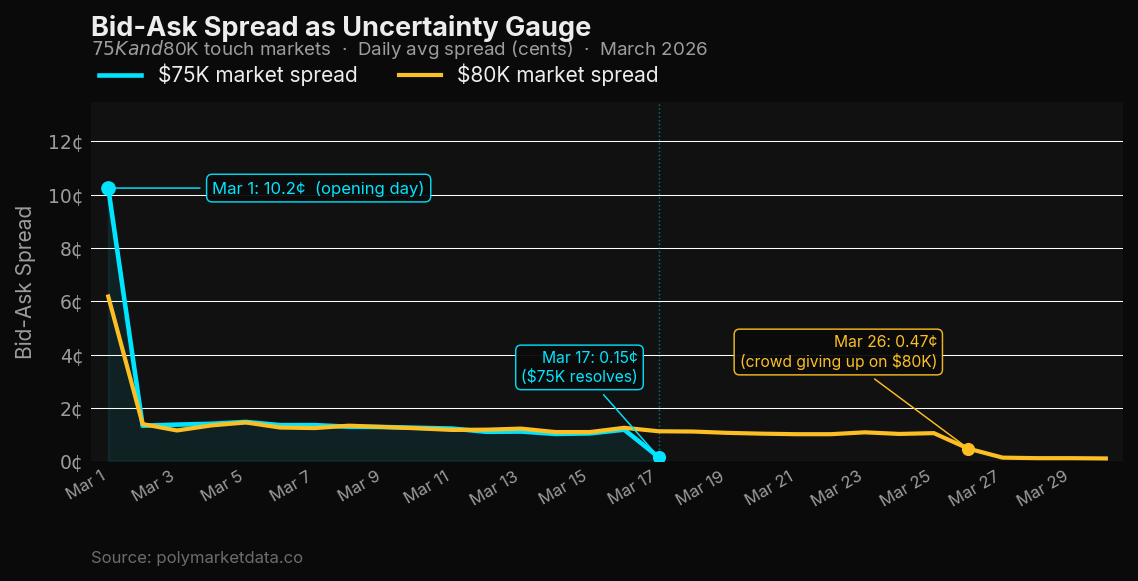 The March 1 spread on the $75K market was 10.2 cents — an enormous uncertainty premium for a binary contract with a maximum payout of 100 cents. That 10-cent spread reflects the fact that no one had strong edge on whether BTC would clear $75K that month when it opened at $67K.
