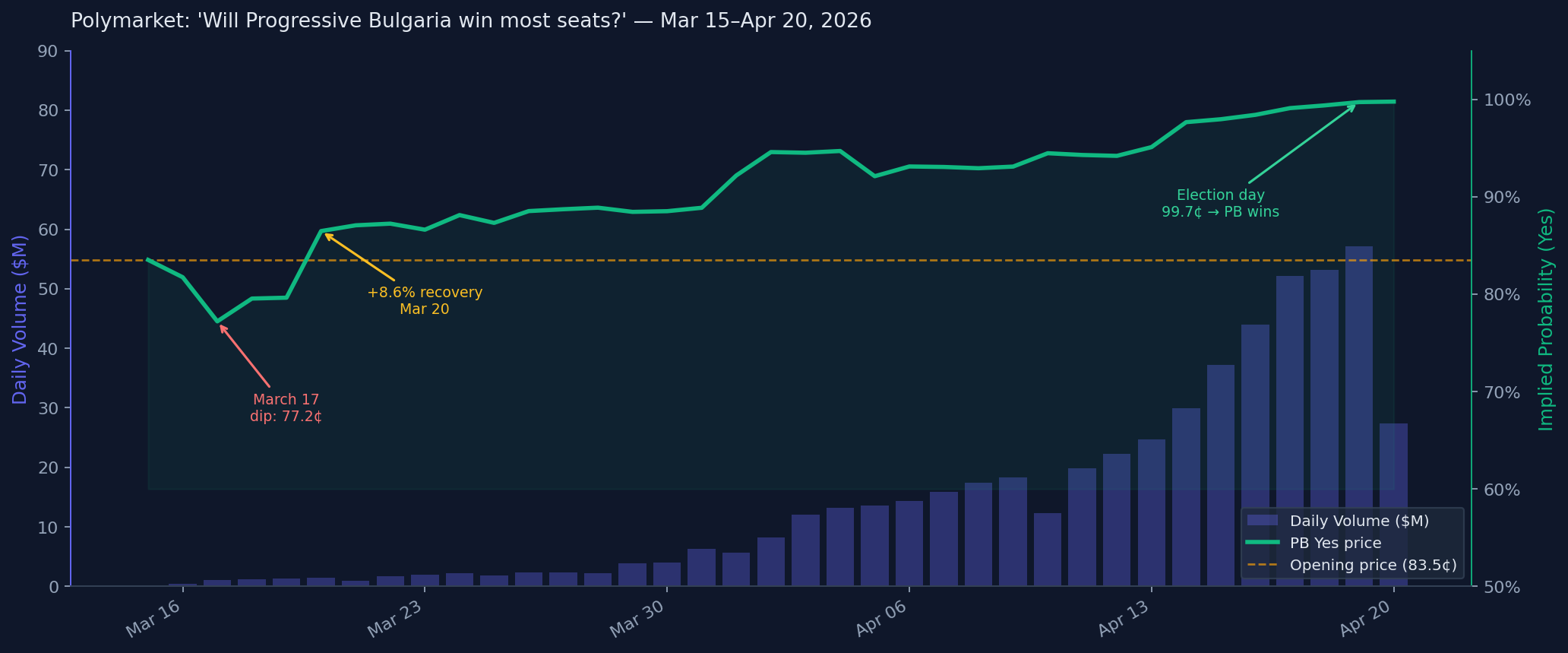 Two things drove this structure. First, pre-election polling had PB around 35% vote share — a number that made most mainstream commentators cautious about calling a majority. Polymarket wasn't cautious. It looked at fragmented opposition (GERB–SDS at ~12%, PP–DB at ~13%, three or four smaller parties splitting the rest) and priced in the correct inference: 35% in that field wins most seats. Second, liquidity grew as the market aged. Daily volume went from $124K on March 15 to $57M on election day — a 460x expansion — which means the final prices reflect far more capital-at-risk than the early prints.