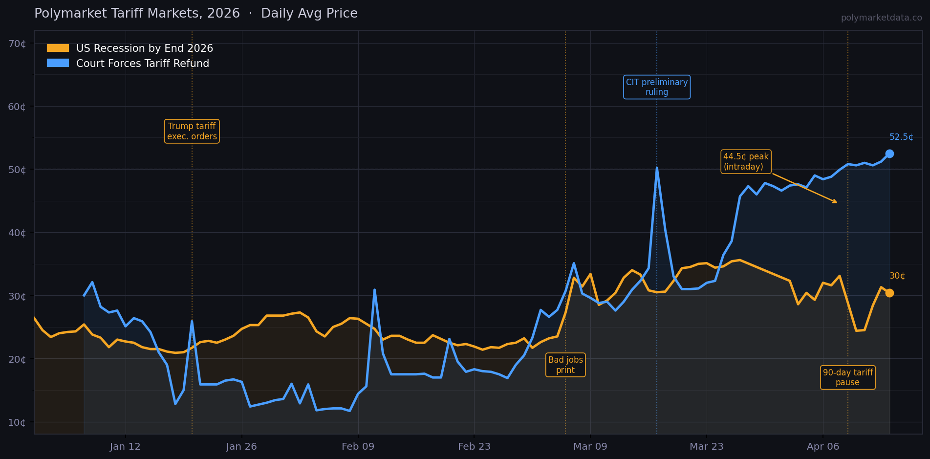 Since early January, Polymarket traders have been building up two distinct positions on the US trade war: the recession odds market, which is loud and volatile, swinging from 20 cents to 44.5 cents and back in a matter of weeks — and the court tariff refund market, which has been quietly, methodically marching upward from 16 cents to 52 cents over the same period. As of today, the court bet has accumulated approximately $497 million in cumulative trading volume and sits exactly on the fence at 52.5¢.